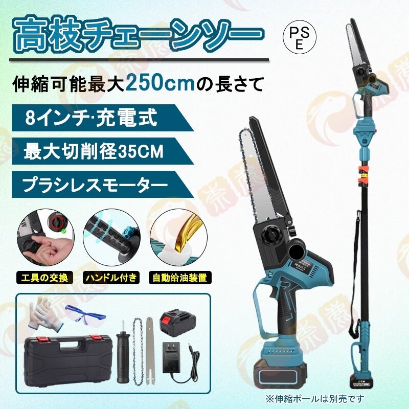 高枝切りチェーンソー 充電式 8インチ バッテリー付き 130~250cm伸縮可能 マキタ 電動ノコギリ 軽量 ブラシレスモーター 角度調節 給油可能 強力 木工切断 家庭用 | onishi9